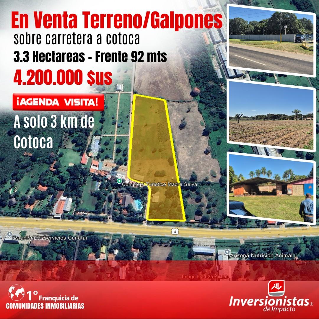 Descripción: Terreno en venta de 3.3 hectáreas (32.916,33 m²) ubicado sobre la carretera a Cotoca, Km 5, con 92 metros lineales de frente asfaltado. La propiedad se encuentra completamente embardada y cuenta con infraestructura operativa, ideal para proyectos comerciales, logísticos o institucionales.